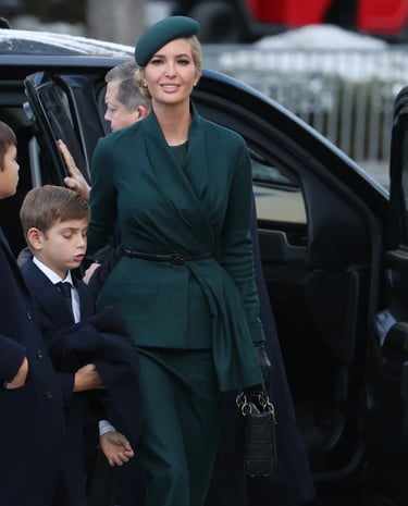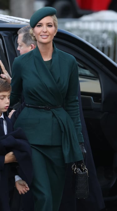 Ivanka’s sleek updo and matching hat added polish to her look, while her choice of black leather gloves and a Lady Dior bag ensured all attention remained on the outfit. Find your own Lady Dior bag here. Her styling was a lesson in how subtle details can elevate a statement ensemble.